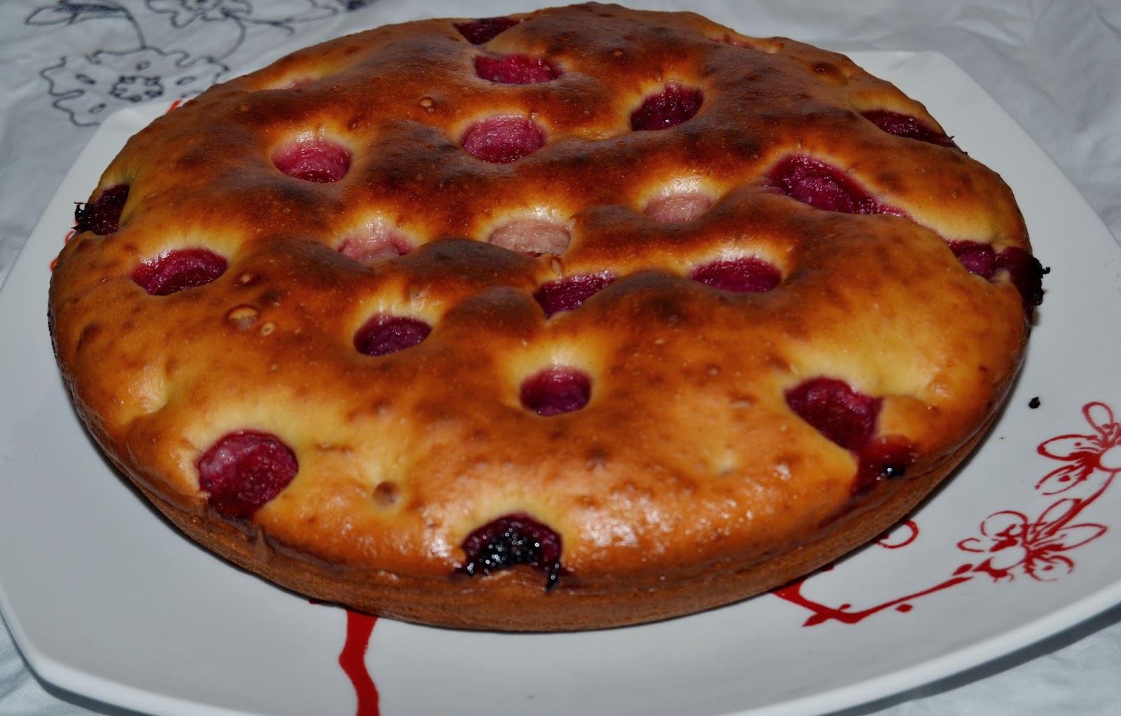 Echar la mitad de la masa, poner unos cuantas de frambuesas o cualquier fruto rojo, cubrir con el resto de la masa, y adornar con más frutos.