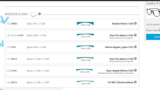 Ahora toca elegir los cristales. Si son unas gafa normales con graduación, tenéis que elegir la primera opción.