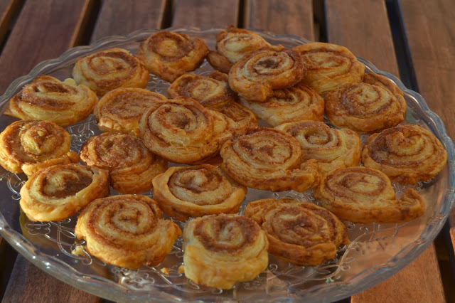 Estirar el hojaldre, untar con un pincel de silicona con agua, y espolvorear la mezcla de azucar y canela. Enrollar como si fuera un brazo de gitano, y cortar a rodajitas. Colocarlas sobre papel vegetal en la bandeja de horno, y con el azucar que sobra espolvorear por encima. Volver a untar con un poco de agua. Llevar al horno unos 10 minutos, o hasta que están doradas. Dejar enfriar, y a comer!!!