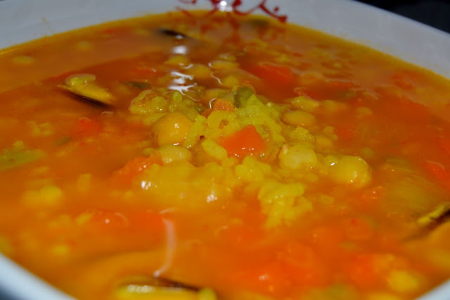 Echar 900 grs de agua, colorante y sal y programar 10min 100º Vel 1. Echar el arroz y programar 12 min 100º Vel 1. Añadir los garbanzos escurridos y lavados y los mejillones, y programar 2 minutos 100º Vel cuchara giro a la izquierda. Dejar reposar 5 minutos y listo para servir!!