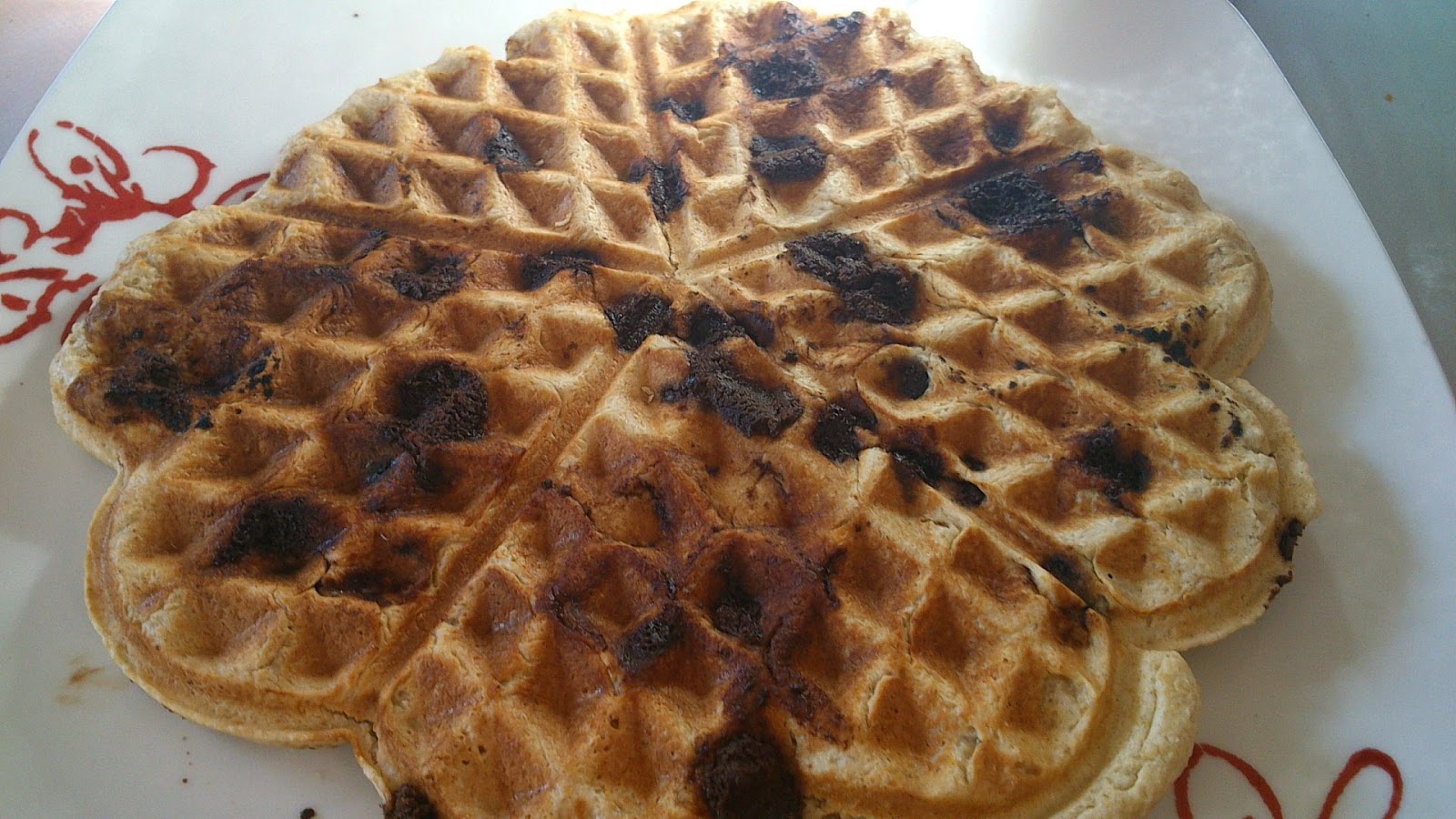 Añadir la mitad de la masa a la gofrera , poner unas pepittas de chocolate por encima y cerrar durante unos minutos (se hace muy pronto). Reservar y repetir la operación. Salen dos gofres grandes, pero aviso, que sacian un montón.