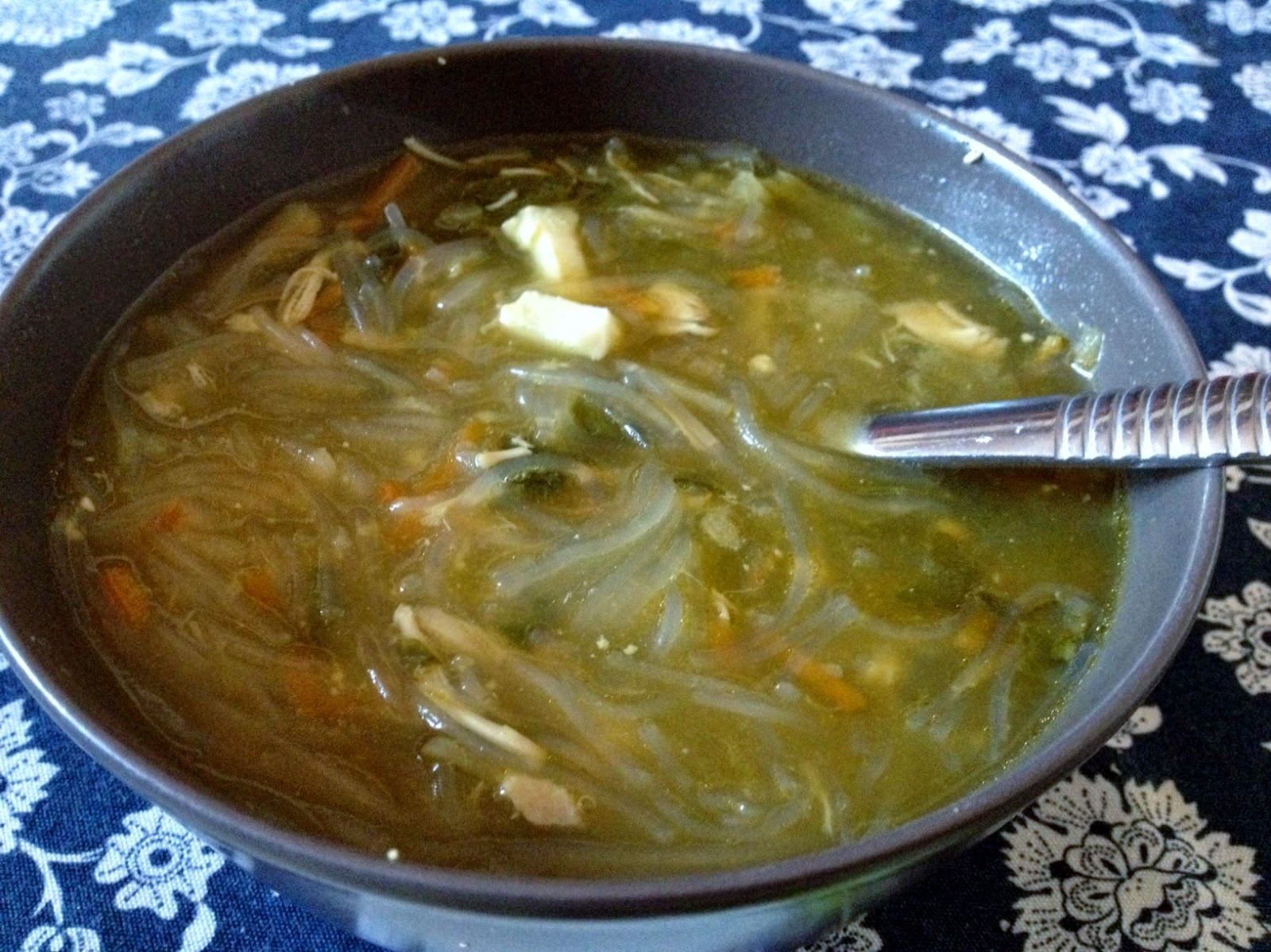 Apartamos en otra olla la cantidad de sopa que necesitamos, en este caso para 2 personas, y ponemos a hervir. Cuando esté en ebullición añadimos los fideos de cristal, la soja, y el vinagre de arroz, y dejamos 5 minutos haciendo chup chup.